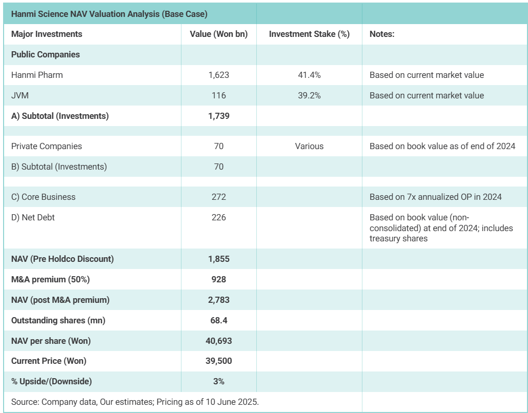 Our NAV valuation of Hanmi Science suggests implied market cap of 2.8 trillion won or NAV per share of 40,693 won per share, which represents just 3% upside from current levels. Hanmi Science's investments in two listed affiliates (Hanmi Pharm and JVM) are worth 1.7 trillion won, which represents 63% of Hanmi Science's market cap.