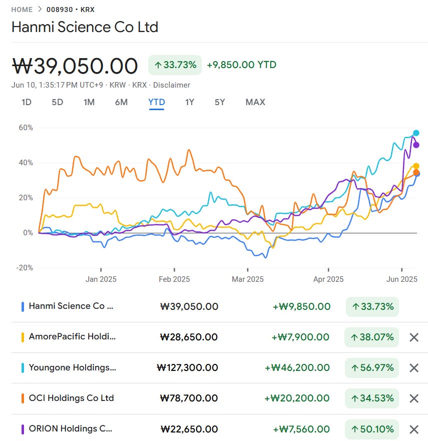 Share price comparisons of Hanmi Science, Amorepacific Holdings, Youngone Holdings, OCI Holdings, and Orion Holdings (YTD, as of 10 June 2025) (Source: Google finance)